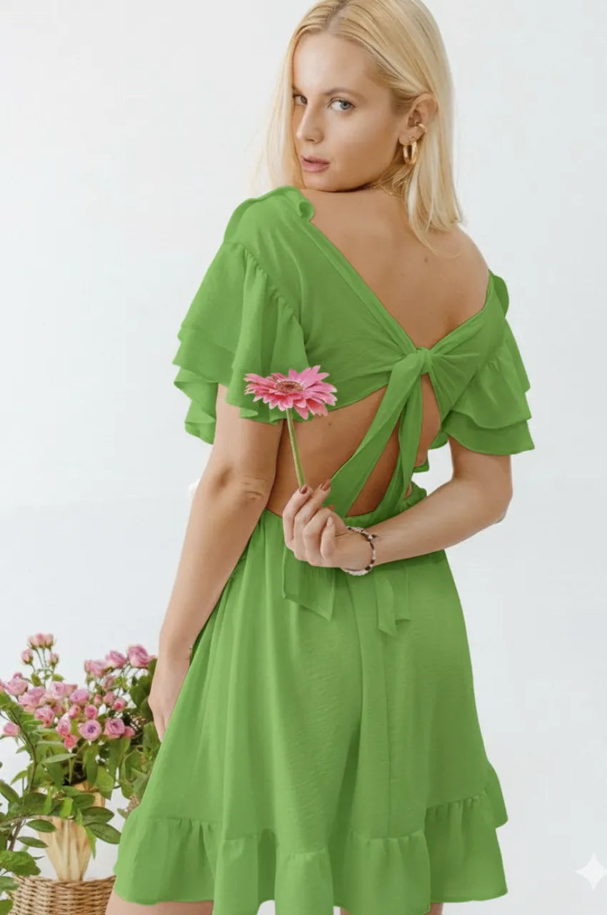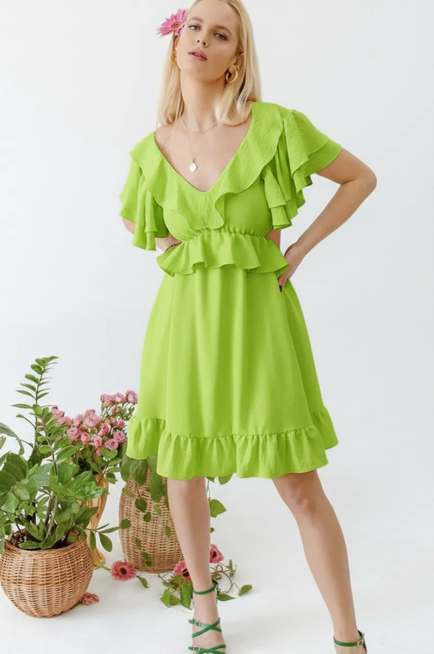 O Vestido Babados + Amarração é um vestido curto em tom verde limão, com modelagem fluida e feminina. Possui decote em V, mangas com babados delicados, recorte lateral sutil e costas abertas com amarração em laço, que garante charme, leveza e um ajuste perfeito ao corpo. Uma peça ideal para quem busca frescor, elegância e personalidade em um único look.